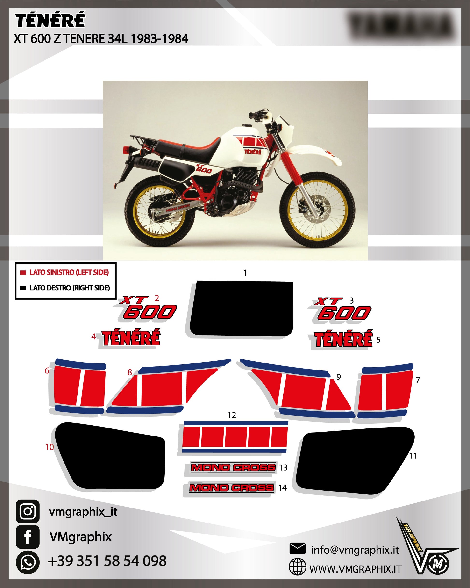 Kit di adesivi compatibili con YAMAHA XT 600 Z XTZ TENERE 34L 1983 - 1984 moto bianca