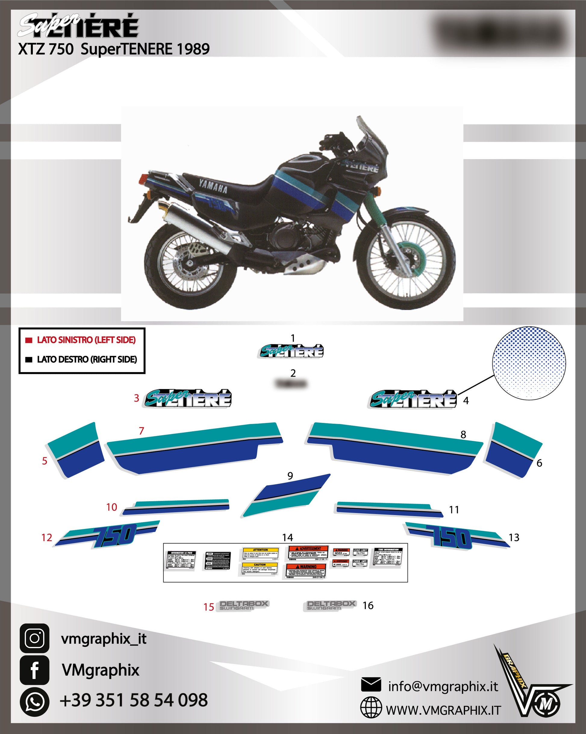 Kit di adesivi compatibili con YAMAHA XT 750 Z XTZ 750 SUPER TENERE 1989 moto nera - azzurra
